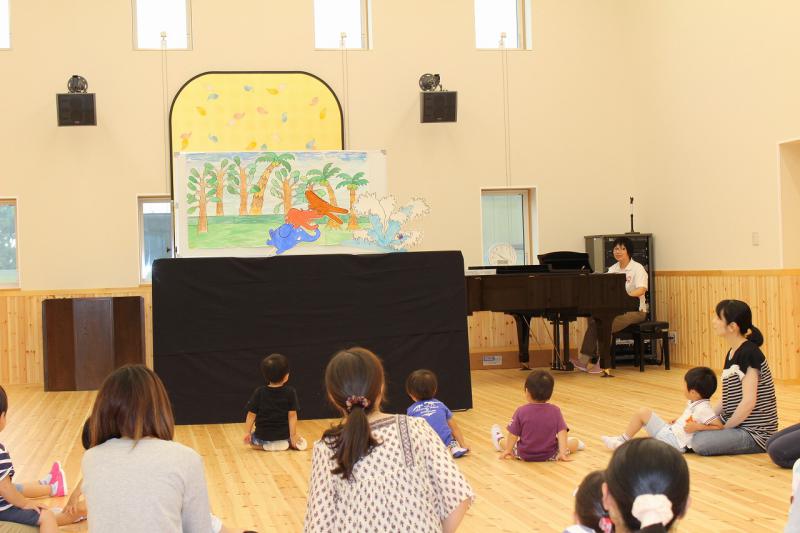 『ぞうくんのさんぽ』のペープサート。 「ぞうさんだー!」、「かめさんもいるよ!」とお話に出てくる動物たちを見てみんな大喜びでしたね。