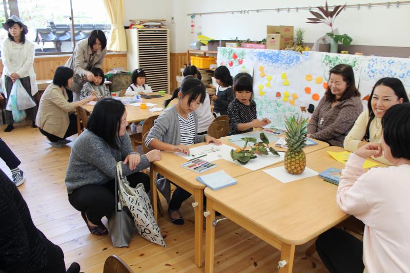 卒園児や卒園児の保護者の方もたくさん見に来て下さいました。 体験コーナーでは園児と卒園児が一緒に折り紙を折ったり、観察画を描いたり、ステンドを作ったりしました。