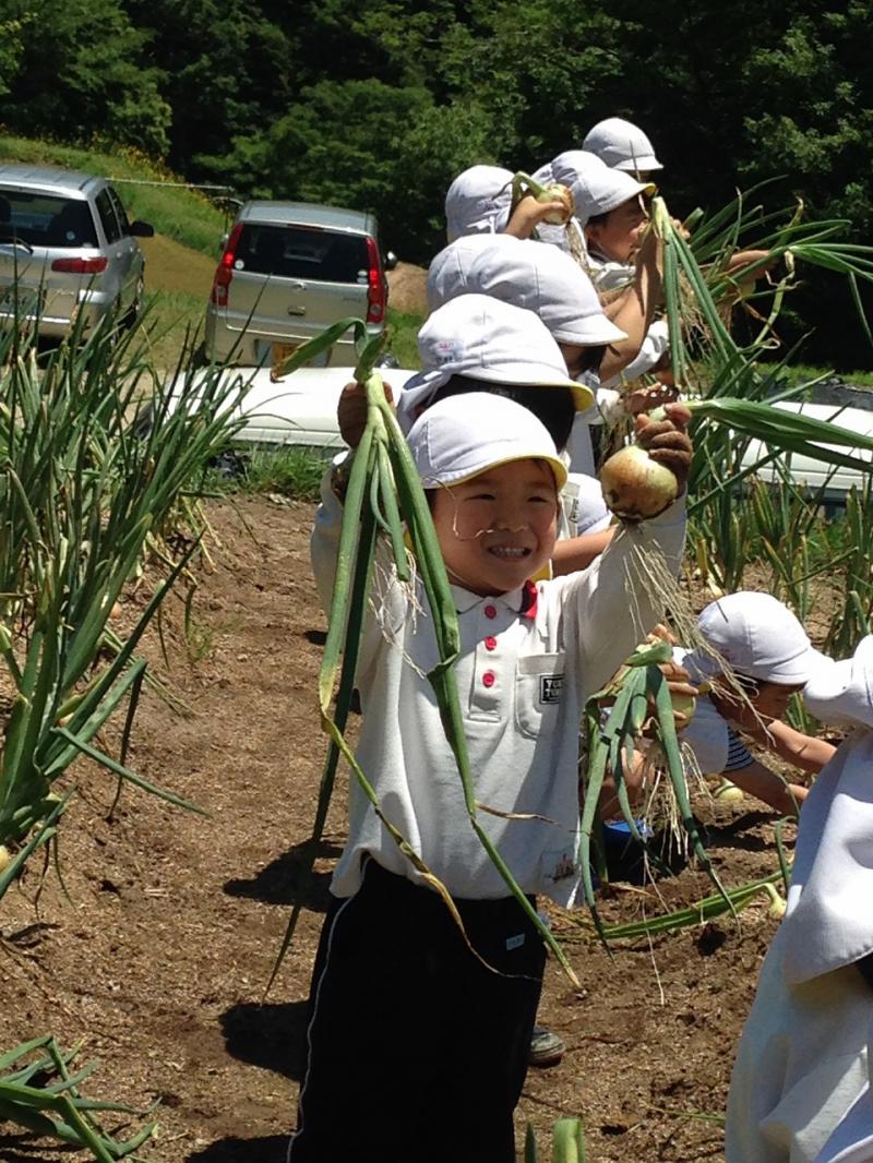 たんちゃん先生から「玉ねぎは葉っぱもおいしいんだよ」と教えていただき、葉がちぎれないように気を付けながら「大きいのがとれた!」「なかなか抜けないよ」と大喜びで収穫していました。