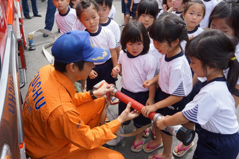 などの子どもたちからの質問にも優しく答えて頂き、大きなホースを持たせてもらってみんな大喜びでした。