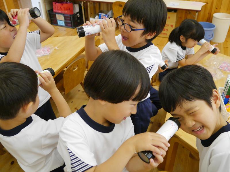 完成して「覗いてみるよ。3・2・1」子供たちは自分で作った万華鏡を覗いた瞬間「うわー!」「きれい~」「キャ~お花の模様になった」と歓声をあげていました。