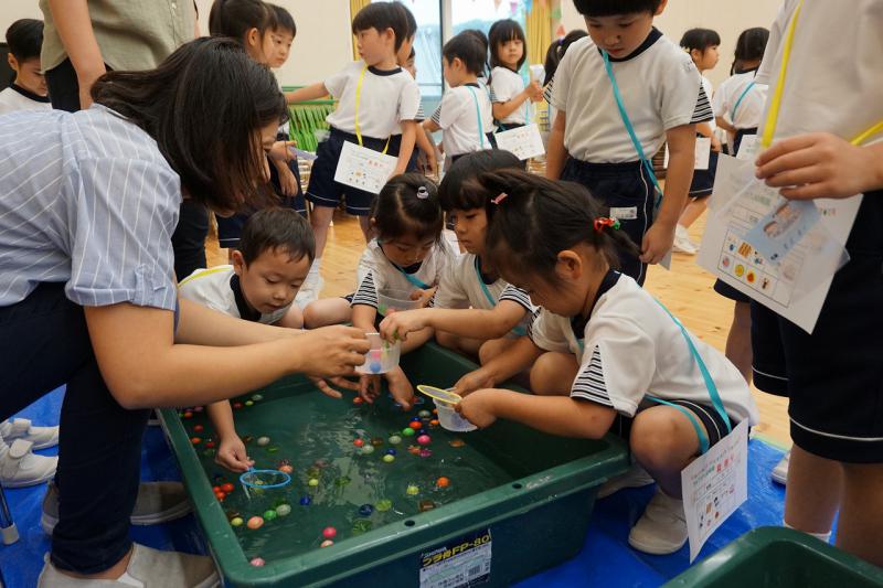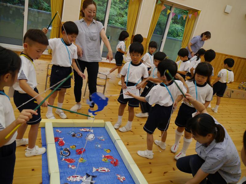 魚釣りやボールすくい、ボーリングなどのいろいろなゲームが全部できるので子ども達も自分でいろいろなゲームのところへ行きとても喜んでゲームをしていました。ゲームが終わったら、カードにシールを貼りました。