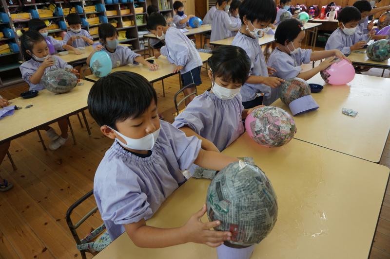 張り子づくりは風船に障子紙を張ることが大変で丸い風船を何に見立てるか想像するまで悪戦苦闘していたお友だちもいましたが、形ができてくるともっとこうしようと色々な発想が湧き出て、個性あふれる見ていても楽しい作品ができましたね。