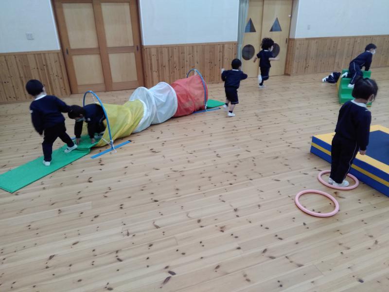 天気の良い日には外で遊び、雨で外に出られない日にはホールの大型遊具でしっかり体を動かして遊んでいます。