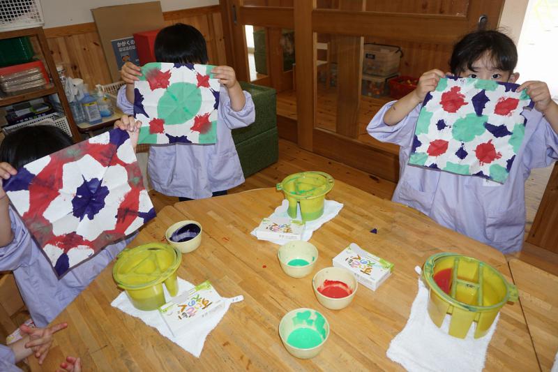 「わーっ」「きれい!」「お花みたい!」と歓声が上がっていました。そして、染め紙が何かに変身しますよ~!