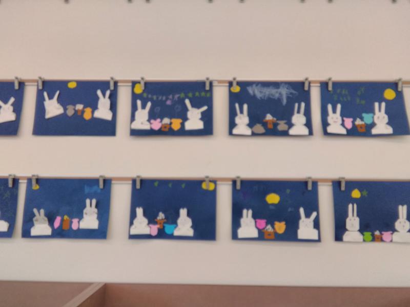 月やお団子、ウサギを切って貼ったり、描いたりして作りました。