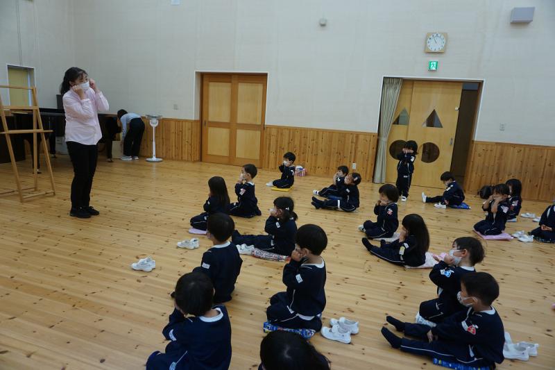 始業式では、副園長先生から「大きい組さんは小さい組さんに教えてあげたりしながら、みんなで仲良く元気に頑張りましょう」とお話がありました。
