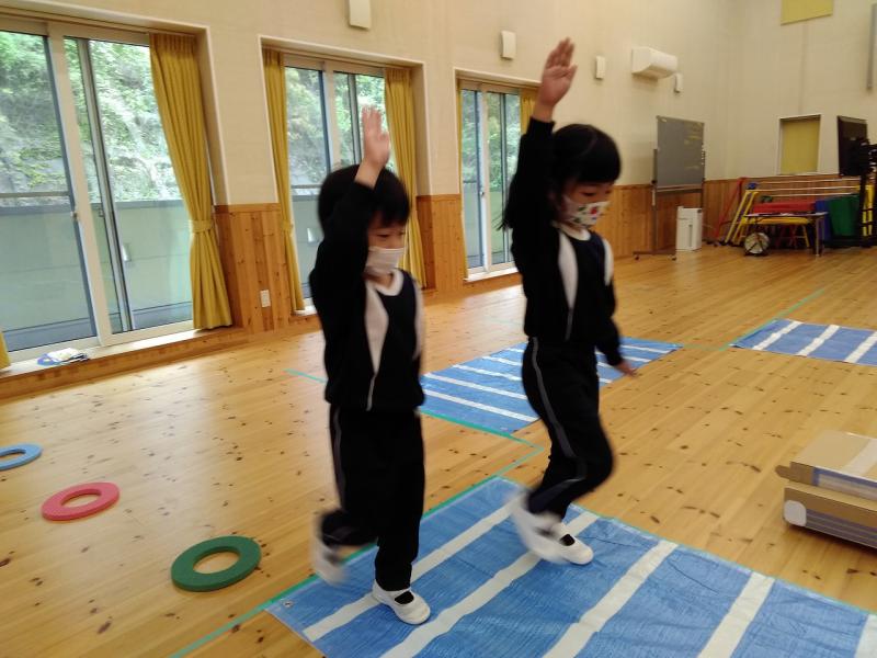 年長児は交通安全についての紙芝居を読み、横断歩道の渡り方や交通ルールの約束を話して、実際にホールで渡る練習をしました。