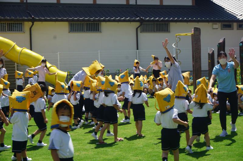 火事の時にはアヒルになって口を押える、津波の時にはチーターになって高い場所へ逃げるなど、火事・津波・地震・台風が起こった時に身を守る動きをゲームで教えて頂きました。