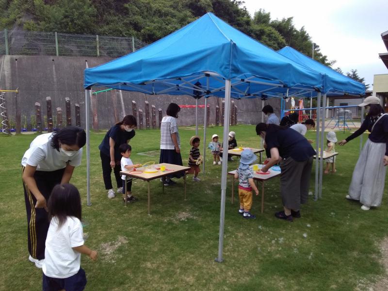 一緒に大きなしゃぼん玉やたくさんのしゃぼん玉を作ったり、追いかけたり楽しく遊びました。