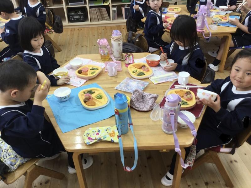「お味噌汁あったかくておいしいー!」「ご飯おかわりしたいです!」などの声がきこえています。