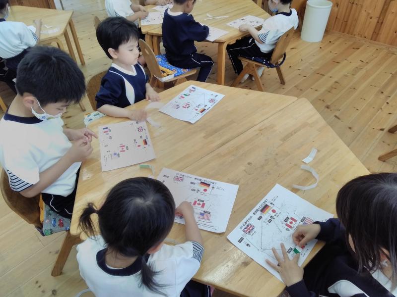 年長組は参加国についてのクイズをした後に、ホールに行きながら国旗の中に書いてある答えを見つけていき、正解した問題に星のシールを貼っていきました。