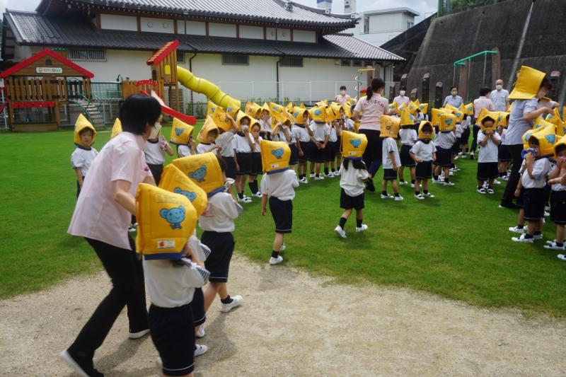 地震の時には・・・アヒルになって「ダック」と言い、頭を守って座る。