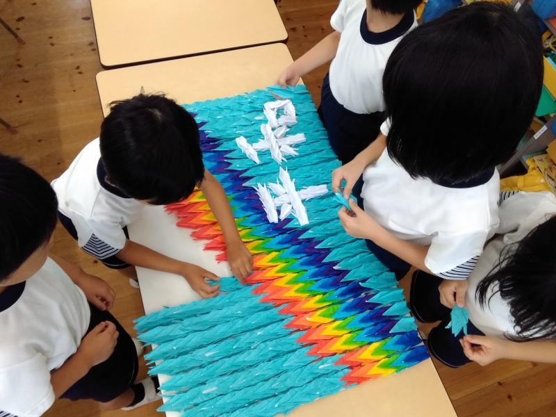 みんなで平和になるようにと願いを込めて折り鶴を作りました。