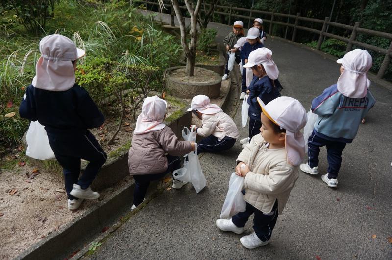 どんぐり・落ち葉拾いでは公園の周りをお散歩しながら鳥のさえずりを聞いたり、様々な色に高揚した葉っぱやどんぐりを見つけました。